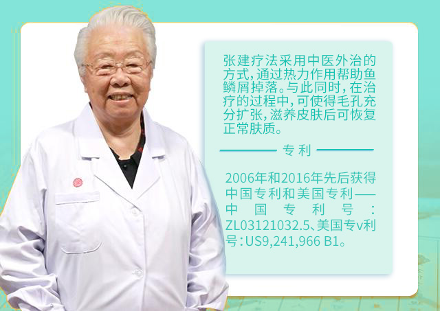 張建療法采用中醫(yī)外治的方式,通過熱力作用幫助魚鱗屑掉落。與此同時,在治療的過程中,可使得毛孔充分擴張,滋養(yǎng)皮膚后可恢復(fù)正常膚質(zhì) 在2006年和2016年先后獲得中國專利和美國專利 中國專利號:ZL03121032.5、美國專利號:US9,241,966 B1。